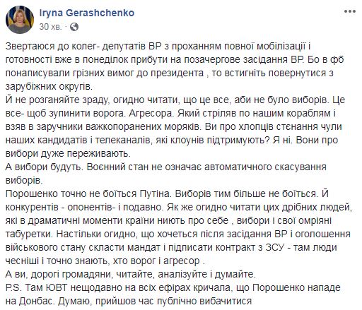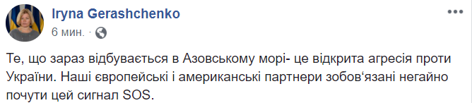 21:20  "То, что сейчас происходит в Азовском мори- это открытая агрессия против Украины. Наши европейские и американские партнеры обязаны немедленно услышать этот сигнал SOS", - написала вице-спикер Верховной Рады Ирина Геращенко.