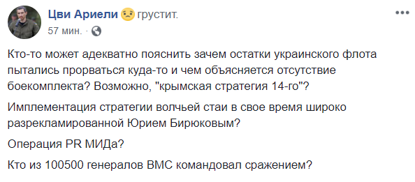 "Кто-то может адекватно пояснить зачем остатки украинского флота пытались прорваться куда-то и чем объясняется отсутствие боекомплекта? Возможно, "крымская стратегия 14-го"?