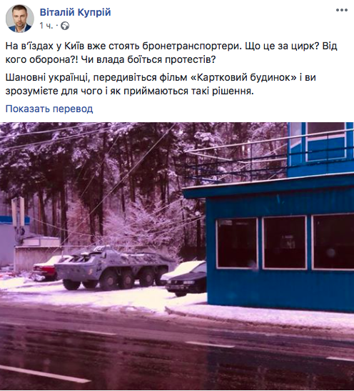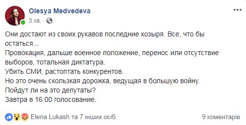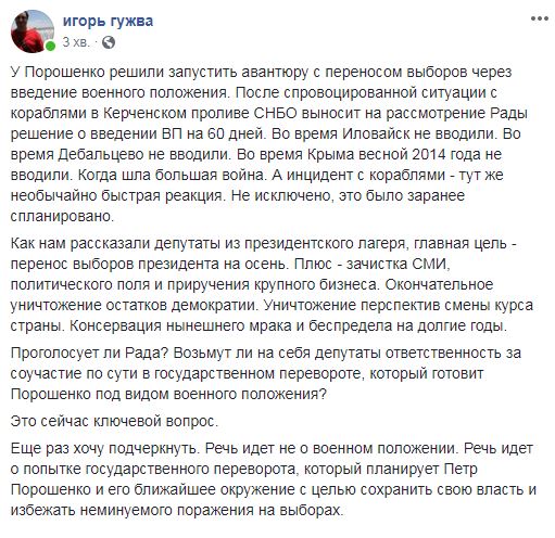 "Возьмут ли на себя депутаты ответственность за соучастие по сути в государственном перевороте, который готовит Порошенко под видом военного положения? Это сейчас ключевой вопрос. Еще раз хочу подчеркнуть. Речь идет не о военном положении. Речь идет о попытке государственного переворота, который планирует Петр Порошенко и его ближайшее окружение с целью сохранить свою власть и избежать неминуемого поражения на выборах".