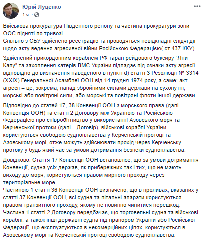 23:25 Генпрокурор Юрий Луценко заявил, что Генпрокуратура и СБУ начали расследовать агрессию России после тарана у Крымского моста.