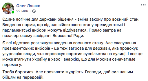"Самое простое объяснение: Петр Алексеевич рассматривает возможность введения военного положения и отмены выборов", - написал в Facebook нардеп Игорь Луценко.