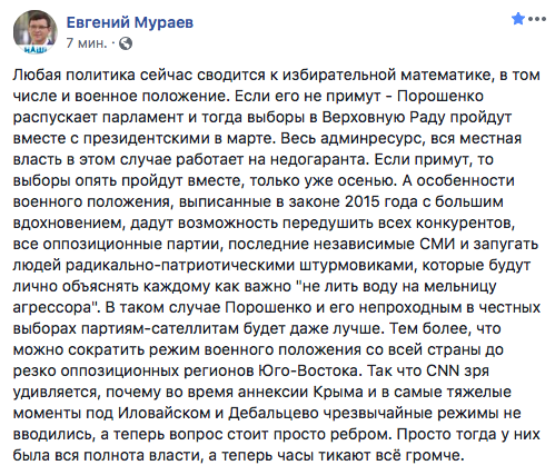 "Любая политика сейчас сводится к избирательной математике, в том числе и военное положение. Если его не примут - Порошенко распускает парламент и тогда выборы в Верховную Раду пройдут вместе с президентскими в марте. Весь админресурс, вся местная власть в этом случае работает на недогаранта.