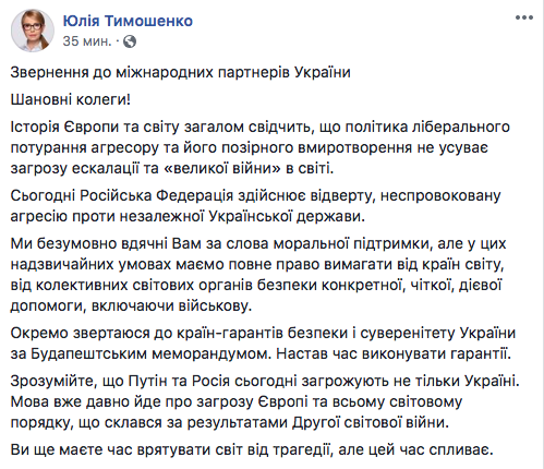 13.10 Юлия Тимошенко опубликовала пост, связанный с морским конфликтом. О военном положении лидер "Батькивщины" не написала ни слова.