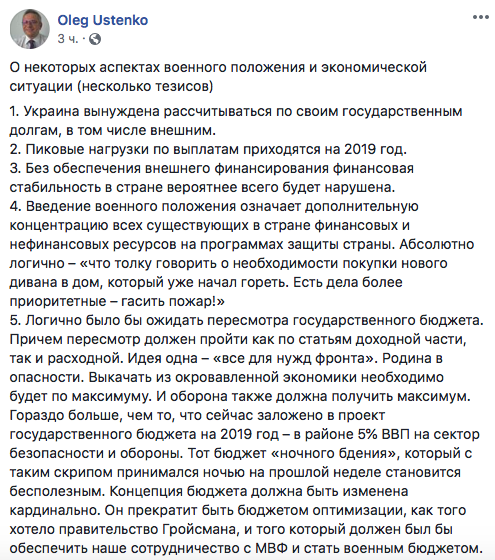 Тот бюджет «ночного бдения», который с таким скрипом принимался ночью на прошлой неделе становится бесполезным. Концепция бюджета должна быть изменена кардинально. Он прекратит быть бюджетом оптимизации, как того хотело правительство Гройсмана, и того который должен был бы обеспечить наше сотрудничество с МВФ и стать военным бюджетом.