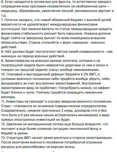 10. Плановый и выстраданный дефицит бюджета в 2% ВВП, в условиях военного положения либо придётся вообще убрать, либо фондировать за счет внутренних заимствований. Внутренние заимствования вряд ли сработают. Попробовать можно, но эффект будет близок к нулю. Поэтому придётся сокращать невоенные расходы.