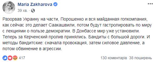 Тем временем свой комментарий дала Мария Захарова, официальный представитель МИД РФ: "Разорвав Украину на части, Порошенко и вся майданная гопкомпания, как сейчас это делает Саакашвили, потом будут гастролировать по миру с лекциями о пользе демократии. В Донбассе мир уже установили. Теперь за Керченский пролив принялись. Бандиты с большой дороги. И методы бандитские: сначала провокация, затем силовое давление, а потом обвинение в агрессии", - написала Захарова.