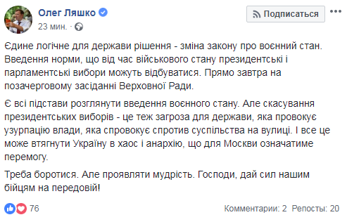 Ляшко намекает, что не проголосует за военное положение, если отменятся выборы президента