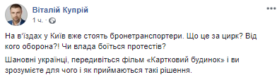 "На въездах в Киев уже стоят бронетранспортеры. Что это за цирк? От кого оборона ?! Или власть боится протестов? Уважаемые украинцы, просмотрите фильм "Карточный дом" и вы поймете для чего и как принимаются такие решения", - написал в Facebook Виталий Куприй.