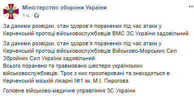 "По данным разведки, состояние здоровья раненых во время атаки в Керченском проливе военнослужащих Военно-морских сил Вооруженных сил Украины удовлетворительное", - говорится в сообщении.