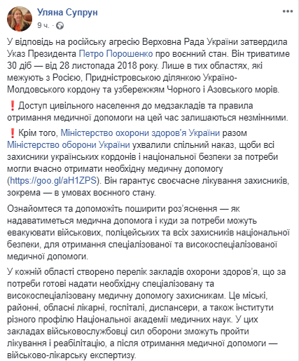 Во время действия режима военного положения, за которое 26 ноября проголосовали депутаты Верховной Рады, доступ гражданского населения в медучреждения и правила получения медицинской помощи остаются неизменными. Об этом на своей странице в Facebook написала и.о. министра здравоохранения Украины Ульяна Супрун.
