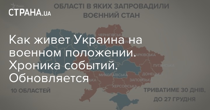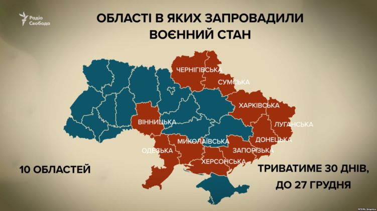 В Украине впервые за все годы независимости ввели военное положение в ряде регионов. Это Винницкая, Луганская, Николаевская, Сумская, Одесская, Харьковская, Черниговская и Херсонская, Донецкая и Запорожская области.