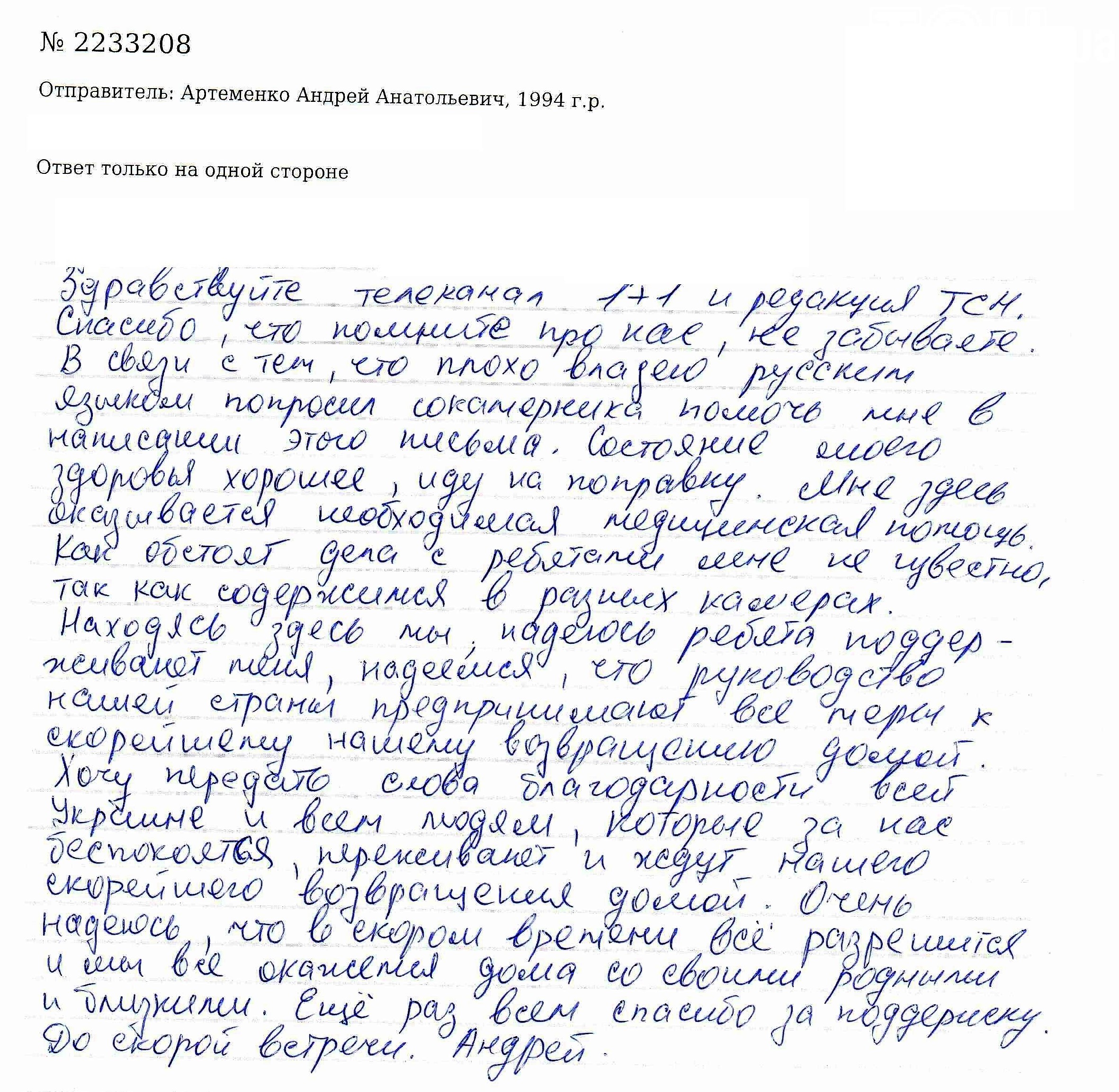 Здравствуйте телеканал 1+1 и редакция ТСН. Спасибо, что помните о нас, не забываете. В связи с тем, что плохо владею русским языком, попросил сокамерника помочь мне в написании этого письма. Состояние моего здоровья хорошее, иду на поправку. Мне здесь оказывают необходимую медицинскую помощь. Каково состояние дел у ребят, мне не известно, поскольку содержимся в разных камерах. Находясь здесь, думаю ребята меня поддержат, надеемся, что руководство нашей страны предпринимает все меры для скорейшего нашего возвращения домой. Хочу передать слова благодарности всей Украине и всем людям, которые о нас беспокоятся, переживают и ждут нашего скорейшего возвращения домой. Очень надеюсь, что в ближайшее время все решится и мы все окажемся дома со своими близкими. Еще раз всем спасибо за поддержку.