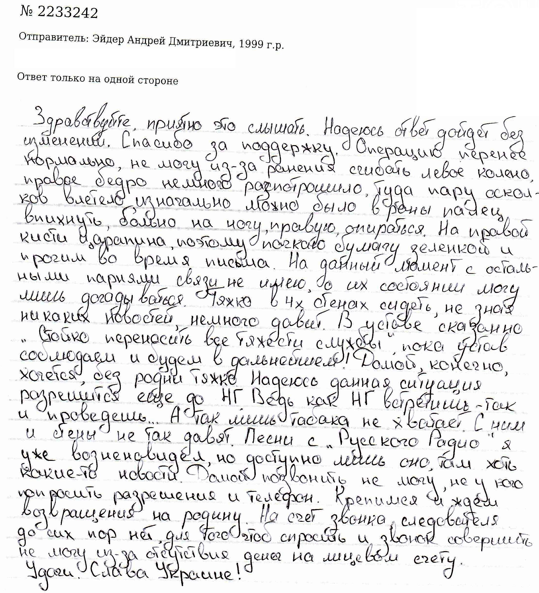 Здравствуйте, приятно это слышать. Надеюсь, ответ будет без изменений. Спасибо за поддержку. Операцию перенес нормально, не могу из-за ранения сгибать левое колено, правое бедро, чуть распотрошило. Туда пару осколков влетело, сначала можно было в раны палец всунуть, больно на правую ногу опираться. На правой руке царапина, поэтому мажу бумагу зеленкой и прочим во время написания. Сейчас с другими ребятами связи не имею. О состоянии могу только догадываться. Тяжело в четырех стенах сидеть и не знать никаких новостей, немного давит. В уставе сказано "стойко переносить все тяготы службы". Пока устав выполняем и будем и в дальнейшем! Домой, конечно, хочется, без родных тяжело. Надеюсь, эта ситуация разрешится еще до Нового года, ведь как НГ встретишь, так его и проведешь. А так только табака не хватает. С ним и стены не так давят. Песни с "Русского радио" я уже возненавидел, но доступно только оно. Там хоть какие-то новости. Домой позвонить не могу, не у кого попросить разрешение и телефон. Держимся и ждем возвращения на Родину. По поводу звонка - следователя до сих пор нет для того, чтобы спросить, и звонок совершить не могу, потому что нет средств на счету. Удачи. Слава Украине!