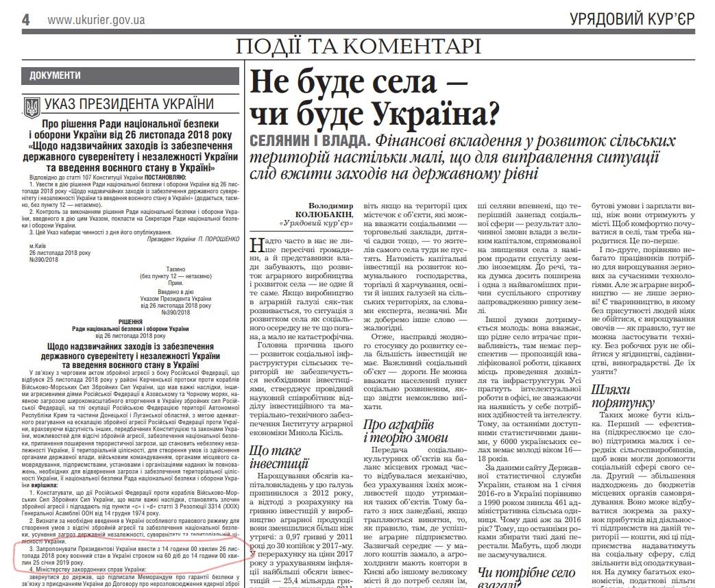 10:24  Газета "Урядовый курьер" опубликовала старую версию указа Порошенко, в котором ВП вводится на 60 дней и по всей Украине. Видимо, на Банковой считали, что депутаты поддержат президентский вариант указа и отдали его в печать. Но слегка просчитались.