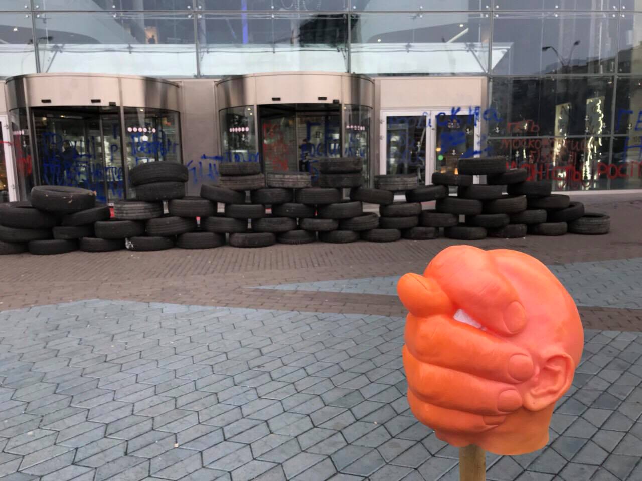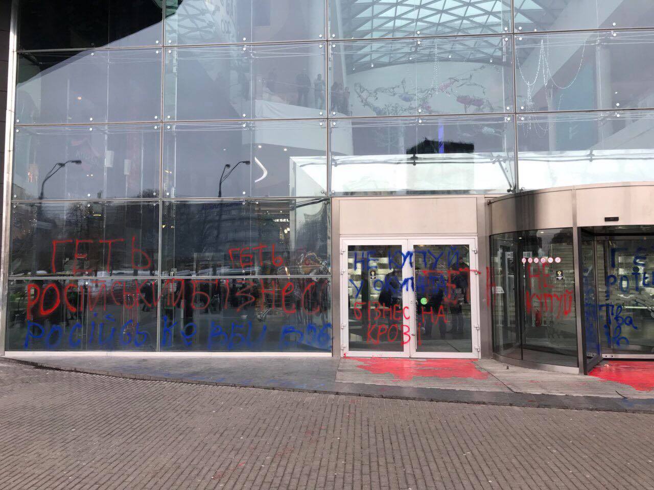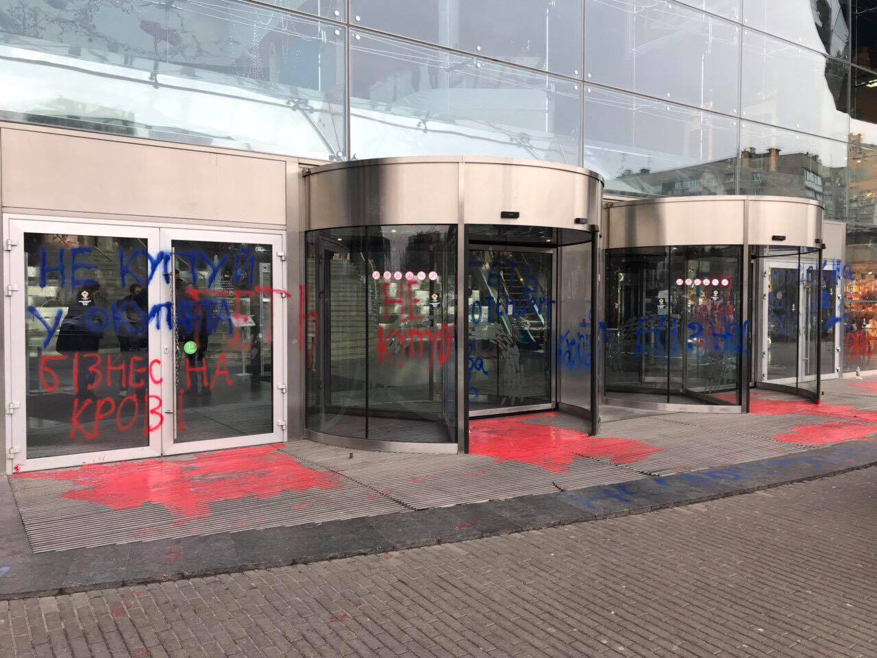 На месте находятся представители правоохранительных органов. На дверях видны надписи: "Бизнес на крови", "Не покупай у оккупантов", "Российское убивает", "Прочь российский бизнес". Самих активистов возле ТРЦ уже нет.