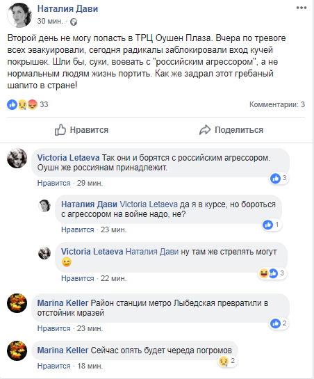 В соцсетях уже выражают возмущение по поводу пикета ТРЦ Ocean Plaza. "Второй день не могу попасть в ТРЦ Ocean Plaza. Вчера по тревоге всех эвакуировали, сегодня радикалы заблокировали вход кучей покрышек. Шли бы, ..., воевать с "российским агрессором", а не нормальным людям жизнь портить. Как же задрал этот гребаный шапито в стране!", - написала киевлянка Наталия Дави.