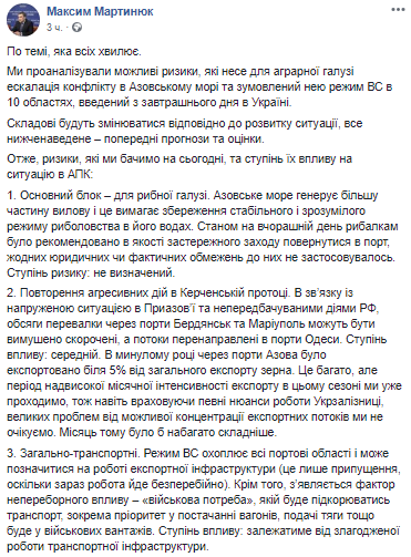 "В связи с напряженной ситуацией в Приазовье и непредсказуемыми действиями РФ, объемы перевалки через порты Бердянск и Мариуполь могут быть вынужденно сокращены, а потоки перенаправлены в порты Одессы. Степень влияния: средний", - указывает заместитель министра.
