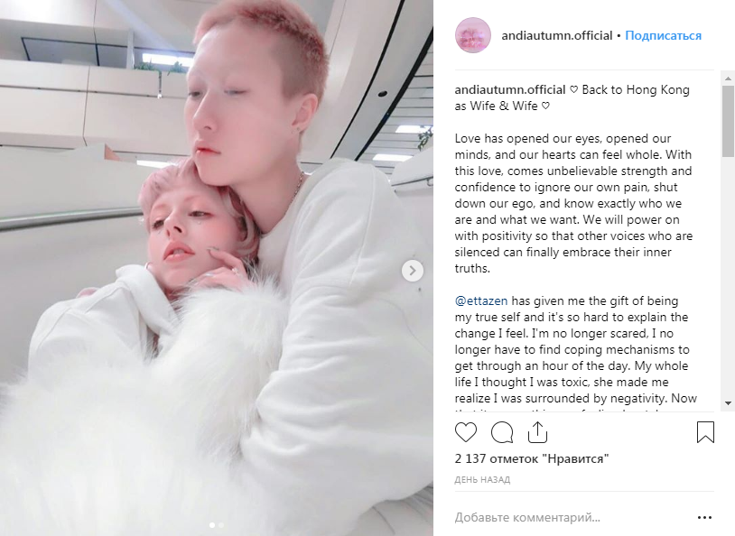 "... Если вы можете мечтать о любви, вы сможете ее найти. Любовь добра, она не осуждает. Любовь это и сила, и слабость. Любовь может изменить. Любовь побеждает!", - написала Этта У Чжолинь в подписи к фото со своей женой.