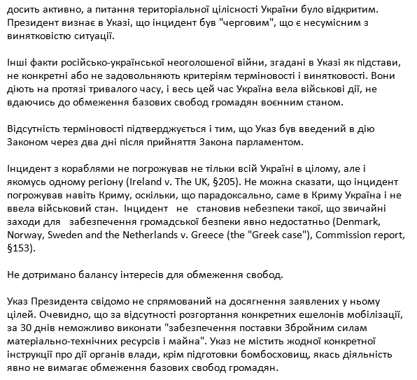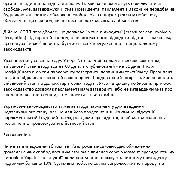 Ранее международная неправительственная организация Freedom House также призвала украинскую власть обосновывать возможное ограничение конституционных прав граждан во время военного положения.