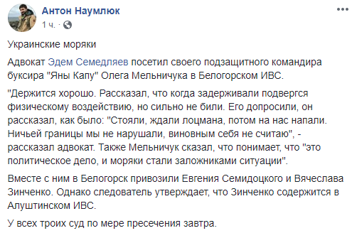 Командир буксира "Яны Капу" Олег Мельничук - один из участников азовского инцидента, сейчас задержанный Россией,  рассказал своему адвокату Эдему Семедляеву, что во время задержания его били, но не сильно, передает журналист "Новой газеты" Антон Наумлюк на странице в Facebook.