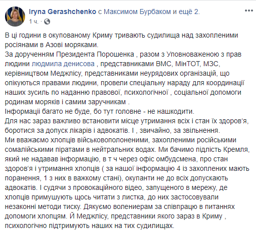 "Мы считаем ребят военнопленными, захваченными российскими сомалийскими пиратами в нейтральных водах. Мы видим подлость Кремля, который не предоставлял информацию, в т. ч. через офис омбудсмена, о состоянии здоровья и содержании ребят (по нашей информации 4 из захваченных имеют ранения, 1 из них в тяжелом состоянии), оккупанты не допускают адвокатов", - написала Ирина Геращенко.