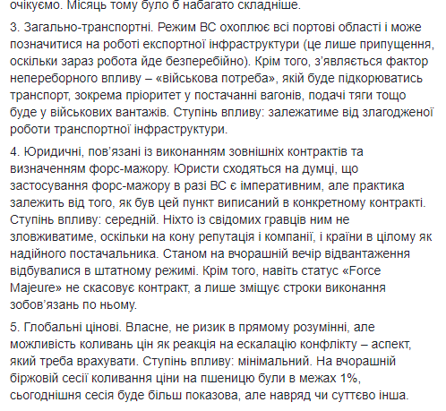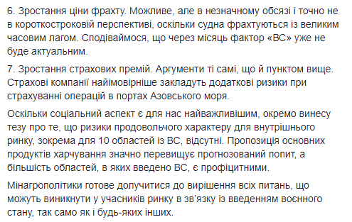 Мартынюк также считает, что режим военного положения может сказаться на работе экспортной инфраструктуры, поскольку он охватывает все портовые области, хотя сейчас работа идет бесперебойно.