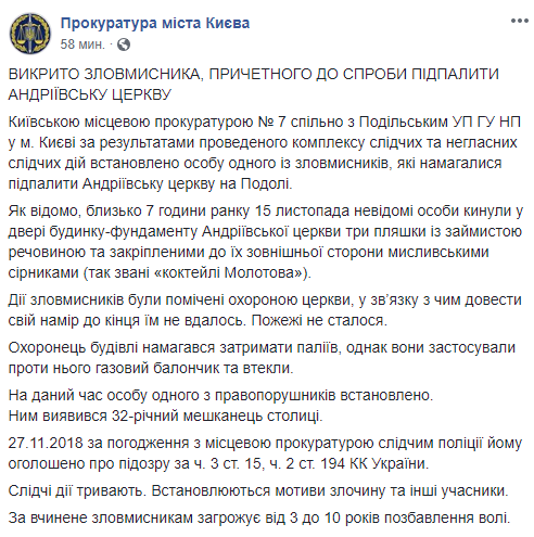 Киевской местной прокуратурой совместно с Подольским УП ГУ ЧП в г. Киеве по результатам проведенного комплекса следственных и негласных следственных действий установлена ​​личность одного из злоумышленников, пытавшихся поджечь Андреевскую церковь на Подоле. Об этом во вторник, 27 ноября, сообщает пресс-служба прокуратуры Киева в Facebook.