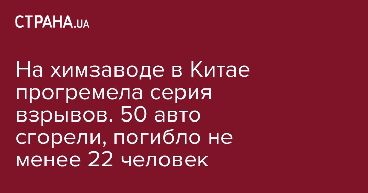 В Китае произошло серьезное ЧП на химзаводе в провинции Хэбэй, в результате которого сгорело 50 автомобилей и не менее 22 человек погибло. Об этом сообщает ТАСС со ссылкой на местное издание "Пэнпай"