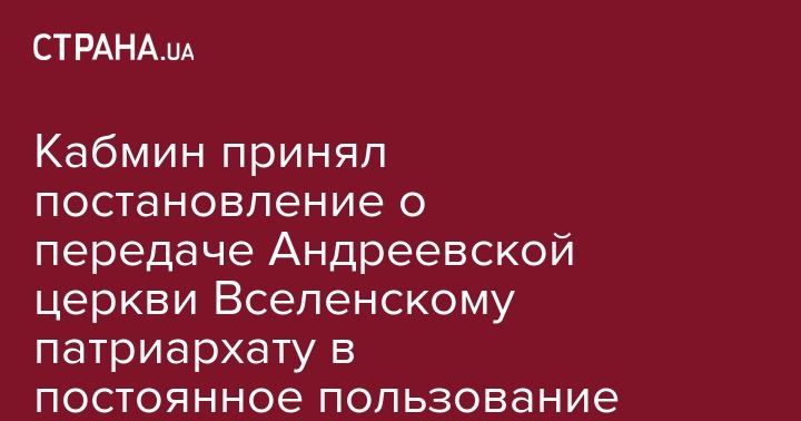 Сегодня, 28 ноября, Кабинет министров Украины принял постановление, согласно которому Андреевская церковь в Киеве переходит в постоянное пользование Вселенскому патриархату. Об этом пишут "Украинские Новости".