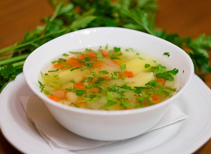Овощной суп с рисом - постное и бюджетное блюдо. Для его приготовления в кипящей воде необходимо отварить рис и нарезанный кубиками картофель. Обжарить на сковороде лук, морковь и помидоры (их кладут в последнюю очередь) и добавить, когда картофель полуготов. После этого нужно посолить суп, а уже готовое блюдо посыпать зеленью.