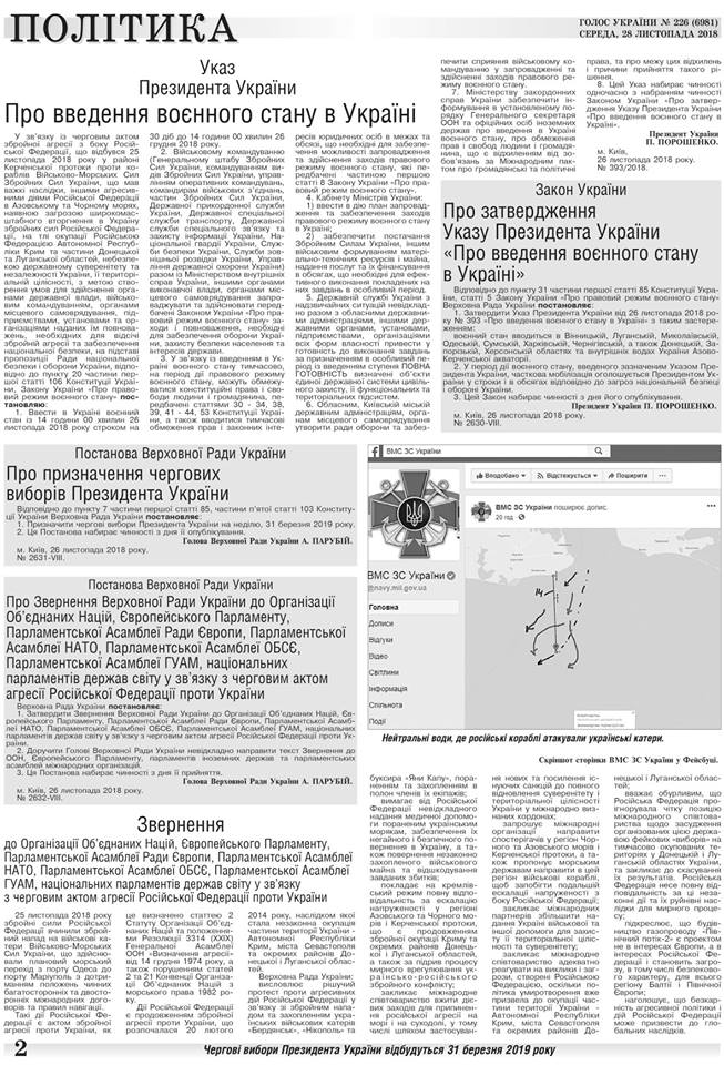 Закон размещен в спецвыпуске издания от 28 ноября №226. Согласно публикации, военное положение введено на 30 суток с 14:00 26 ноября по 14:00 26 декабря 201. Спецвыпуск доступен как в бумажном виде так и в интернете.