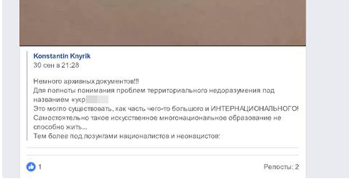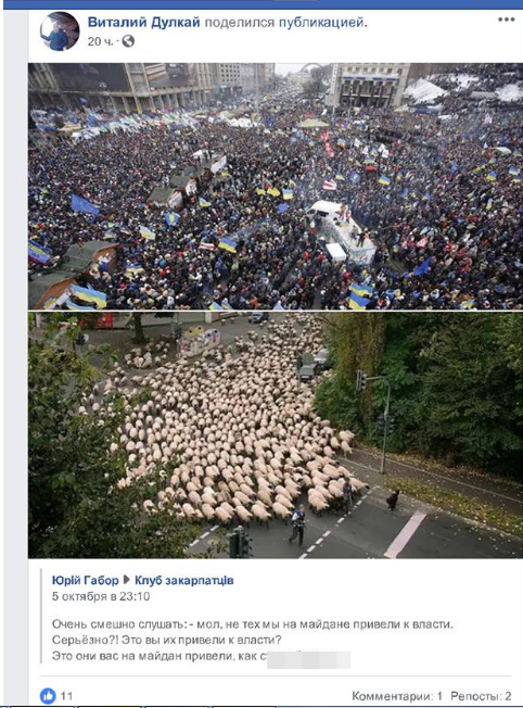 В частности на фотоснимках постов с его страницы говорится про "территориальное недоразумение", а участники Евромайдана в посте называются "стадом баранов".