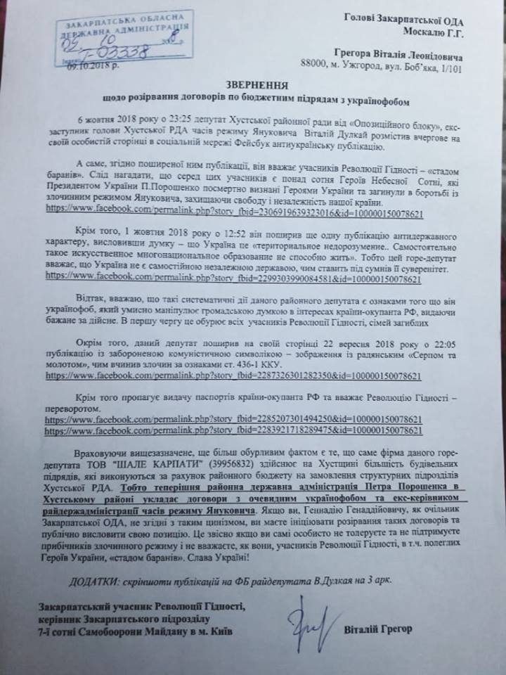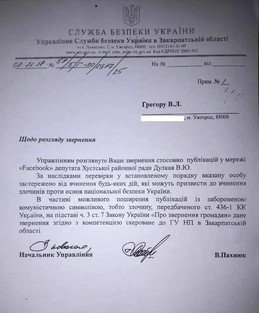 В ответе силовиков говорится, что они приняли меры в отношении Виталия Дулкая. Заявляется, что основанием для этого стало многократное распространение депутатом на своей личной странице в Facebook провокационных публикаций на русском языке, которые назвали украинофобскими.