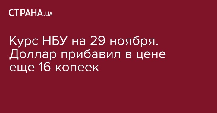 Нацбанк на 29 ноября 2018 года установил официальный курс гривны к доллару на уровне 28,27 грн/доллар, что на 16 копеек выше по сравнению с предыдущим банковским днем. Об этом свидетельствуют данные на сайте регулятора. В частности, официальный курс гривны к доллару на 29 ноября установлен на уровне 2826,9049 гривен за 100 долларов (+16,3715 гривен).