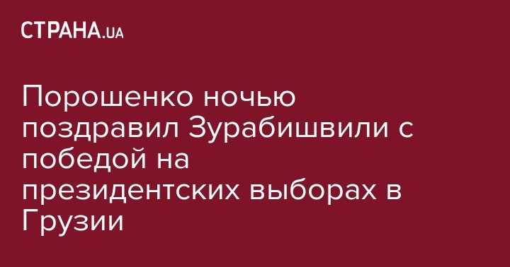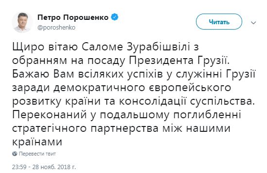 Президент Украины Петр Порошенко в полночь, 29 ноября, поздравил Саломе Зурабишвили с победой на выборах президента Грузии. Об этом глава государства написал на своей странице в Twitter.