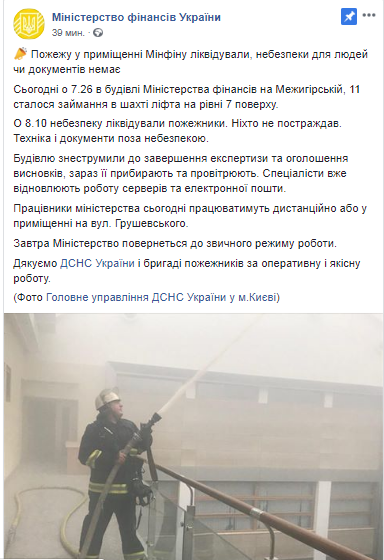 В пятницу, 30 ноября, Минфин полностью вернется к обычному режиму работы. Также сообщается о том, что опасности для людей нет, а все важные документы уцелели, техника также не пострадала.