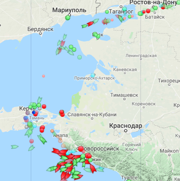 На трекинг-сервисе Marine Traffic видно, что кораблей у Мариуполя и Бердянска действительно нет. Зато большой поток судов следует в сторону российского Таганрога.