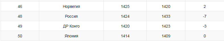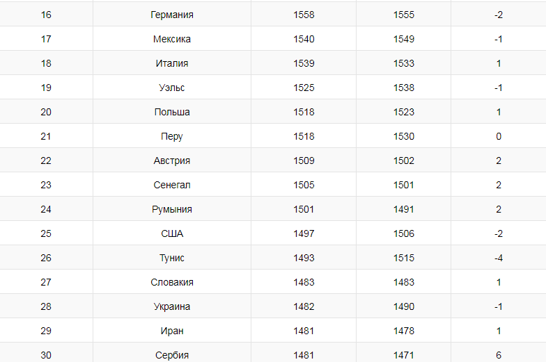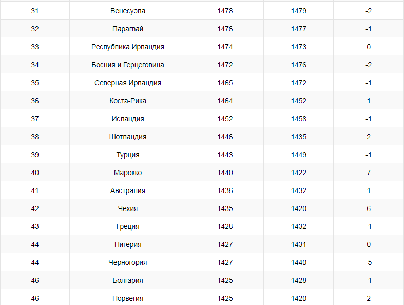 Среди десятки лучших сборных мира одно изменение - Португалия (6) поменялась местами с Уругваем (7). Команда Швеции поднялась с 17-го на 14-е место. Также отмечаются "прыжки" чехов и сербов на 6 мест вверх.