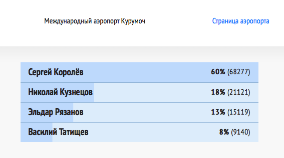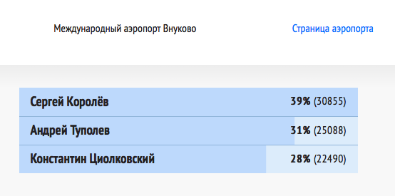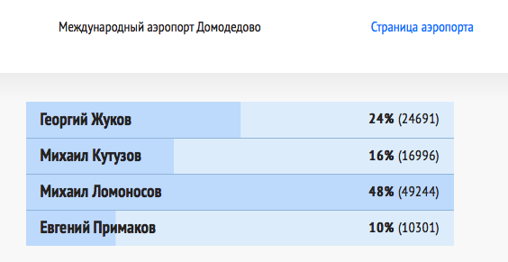 Шорт-листы для голосования формировались на основании вариантов, предложенных россиянами - в некоторых городах кандидаты дублируются. Поэтому Ломоносов победил и в его родном Архангельске, жители которого тоже хотят назвать его именем воздушную гавань.
