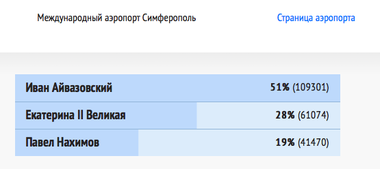 В голосовании за название для главного аэропорта полуострова наблюдается самая высокая активность среди всех 47 портов. С двухкратным отрывом побеждает уроженец Крыма, художник Иван Айвазовский.