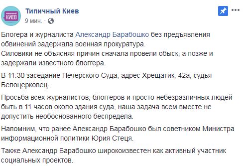 Суд состоится в 11.30, заседание будет вести судья Олег Белоцерковец, пишет группа "Типичный Киев" в Facebook. "Блогера и журналиста Александр Барабошко без предъявления обвинений задержала военная прокуратура. Силовики не объясняя причин сначала провели обыск, а позже и задержали известного блогера. В 11.30 заседание Печерского суда, адрес Хрещатик, 42а, судья Белоцерковец", - говорится в сообщении.