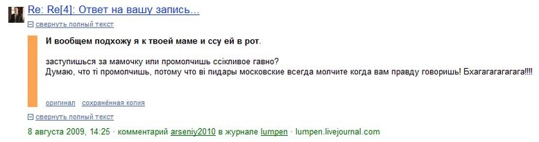 Проблема в том, что lumpen забыл перелогиниться и ответил оппоненту от имени arseniy2010. Петров  удалил комментарий и продублировал его уже от своего имени, но было поздно - Яндекс сохранил в кеше такой "комментарий кандидата в президенты Украины".