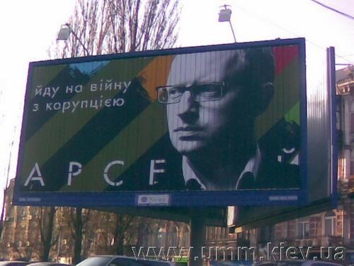 Отметим, что будущий лидер "Народного фронта" еще тогда пытался уйти от имиджа "ботана" и пытался показать себя сильным политиком. Его борды были раскрашены в камуфляжные цвета и слоганы пестрели тревожными словами "война" и "спасение страны".