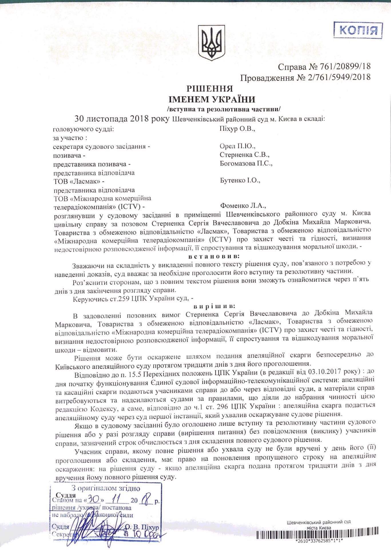 Сегодня, 30 ноября, Шевченковский райсуд Киева отказал в признании публикаций "Страны", заявлений нардепа Михаила Добкина и сюжетов, которые выходили в эфире телеканала ICTV, порочащими честь и достоинство одесского национал-радикала Сергея Стерненко, который в мае 2018 зарезал человека.