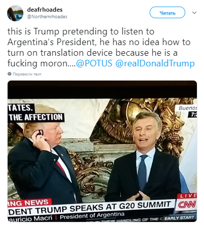 Президент США Дональд Трамп разочаровался в синхронном переводе во время приветственной речи аргентинского коллеги Маурисио Макри и бросил приемник, из которого звучал перевод на пол. Видео из президентской резиденции в Буэнос-Айресе опубликовано в  Facebook на странице Rioja Noticias.