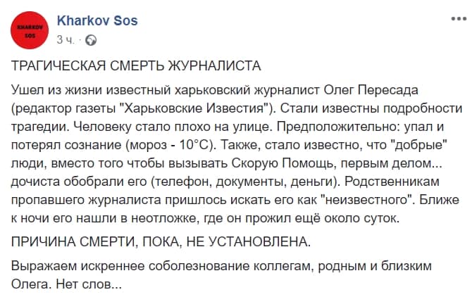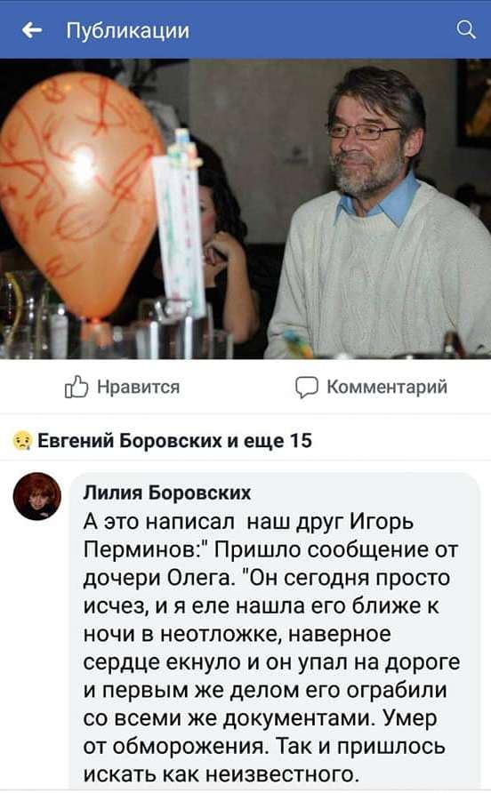 "Пришло сообщение от дочери Олега: "Он сегодня просто исчез, и я еле нашла его ближе к ночи в "неотложке". Наверное, сердце екнуло, и он упал на дороге. И первым делом его ограбили со всеми же документами. Умер от обморожения. Так и пришлось искать как неизвестного", - сообщила в  Facebook харьковчанка Лилия Боровских.