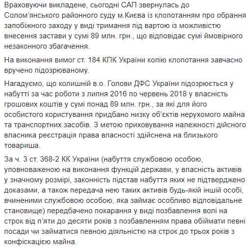 "Сегодня САП обратилась в Соломенский райсуд Киева с ходатайством об избрании ему меры пресечения с возможностью внесения залога в сумме 89 млн грн, что соответствует сумме вероятного незаконного обогащения", - подчеркивается в сообщении.