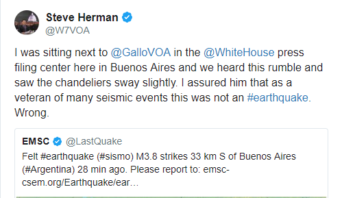 "Я сидел рядом с Уильямом Галло в пресс-центре Белого Дома здесь, в Буэнос-Айресе, и мы услышали гул и увидели, что люстры слегка качаются. Я, как ветеран многих сейсмических событий, заверил его, что это не землетрясение. Я ошибся", - написал у себя в Twitter Херман.