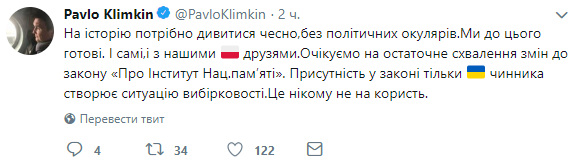 "На историю нужно смотреть честно, без политических очков. Мы к этому готовы. И сами, и с нашими польскими друзьями. Ожидаем окончательного одобрения изменений в закон "Об Институте нацпамяти". Присутствие в законе только украинского фактора создает ситуацию избирательности. Это никому не на пользу", - написал Павел Климкин в соцсети.
