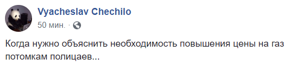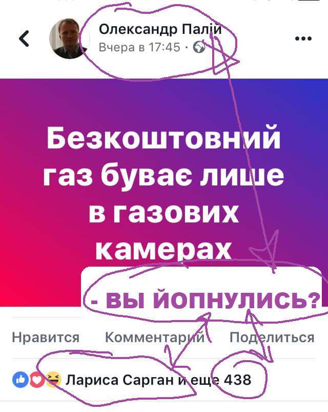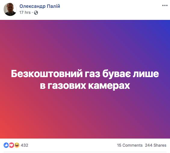 "Бесплатный газ бывает только в газовых камерах", - написал Палий у себя в Facebook, но позже скрыл этот пост из общего доступа.